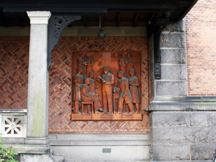 Under et halvtag på muren af Laboratoriebygningen hænger et relief i ler. Relieffet er udført af kunstneren Svend Rathsack, der egentlig var uddannet som maler fra kunstakademiet, men efterfølgende stort set kun arbejdede som billedhugger.