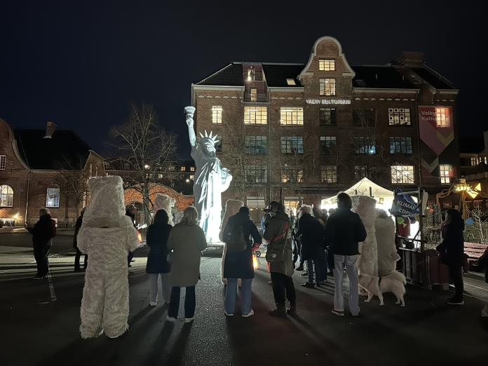 Fredagen begyndte med klimalitteratur på biblioteket og et farverigt åbningsoptog med rappende sprechstallmeister, dansende isbjørne og dyrenes klagekor, mens elever fra Københavns Åbne Gymnasium bagte pandekager på Toftegårds Plads. Her talte vi ned til tændingen af Jens Galschiøts ”Freedom to Pollute”, Frihedsgudinden i ny fortolkning som hele weekenden stod som skarp kommentar til både Trumps genkomst og den globale tøven over for klimaansvaret.