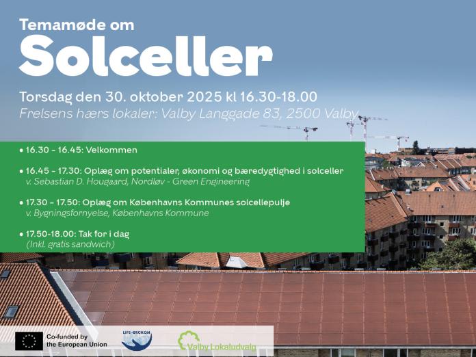 Valby lokaludvalg og Københavns Kommune sætter fokus på solceller i byen. Kom og bliv klogere på hvordan du og din boligforening kan sætte solceller op.